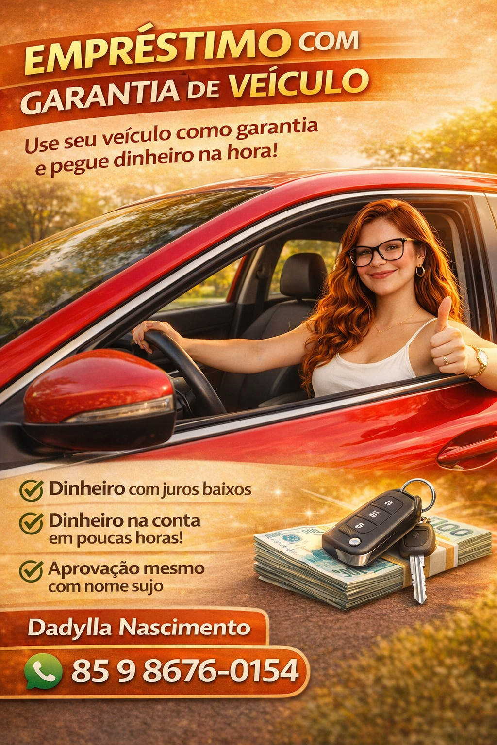 O empréstimo com garantia de veículo permite usar o carro ou moto como garantia para conseguir crédito. Mesmo com o veículo em garantia, o cliente continua usando normalmente. Geralmente oferece valores maiores e juros menores. A aprovação depende da análise da financeira e da avaliação do veículo.